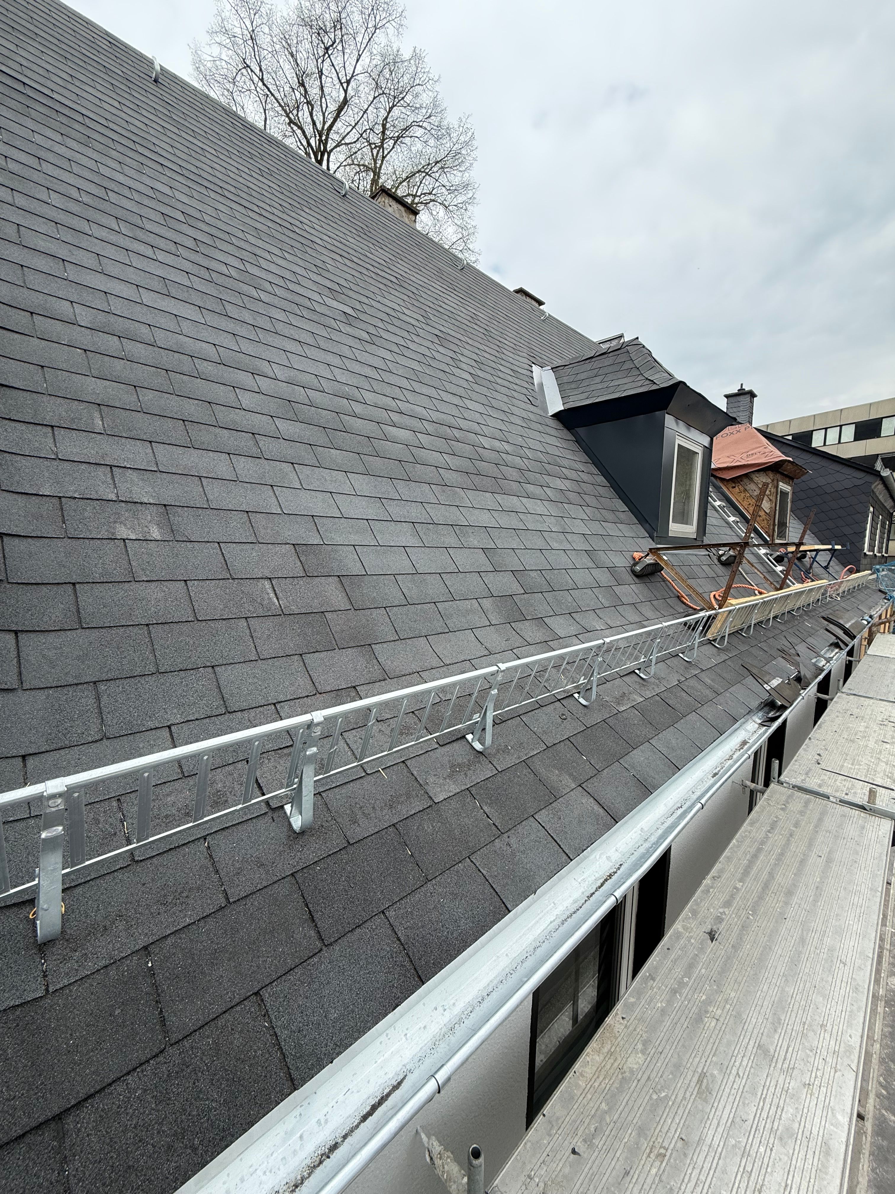 Die Gauben wurden als Schleppgauben ausgeführt und erweitern den nutzbaren Raum im Dachgeschoss deutlich. Wir haben die Gauben komplett mit Bitumenschindeln eingedeckt, sodass ein einheitliches Erscheinungsbild entsteht.