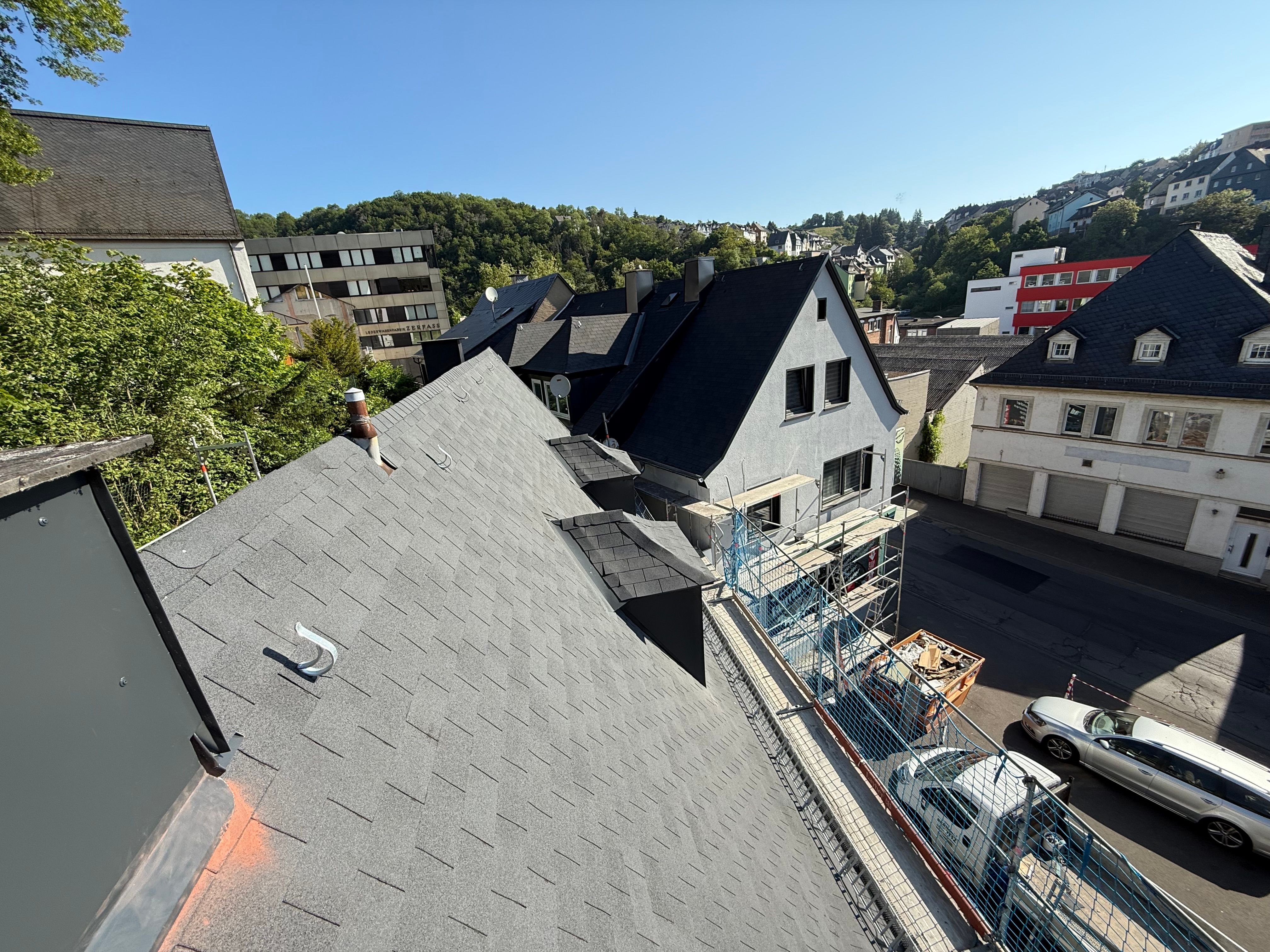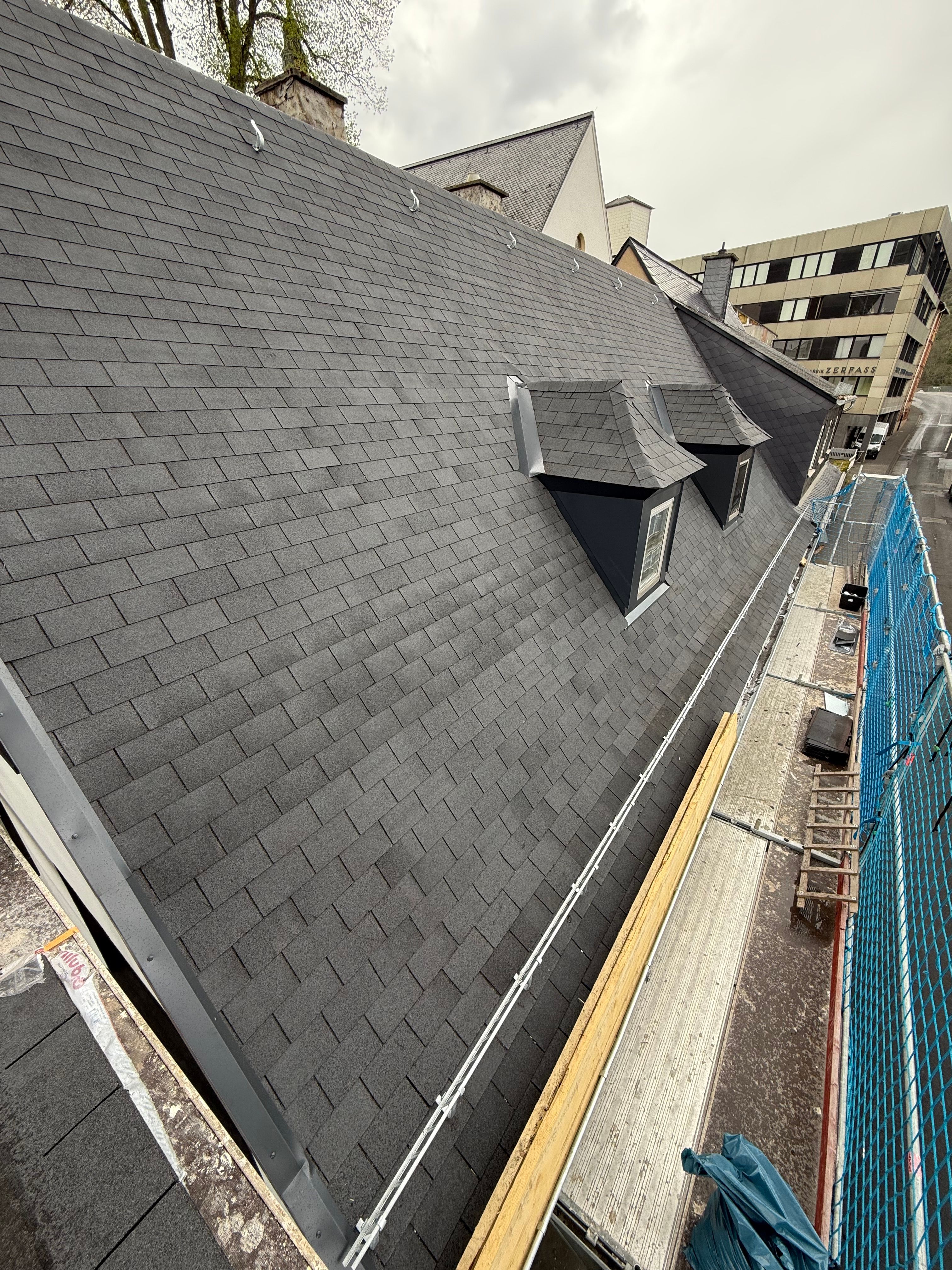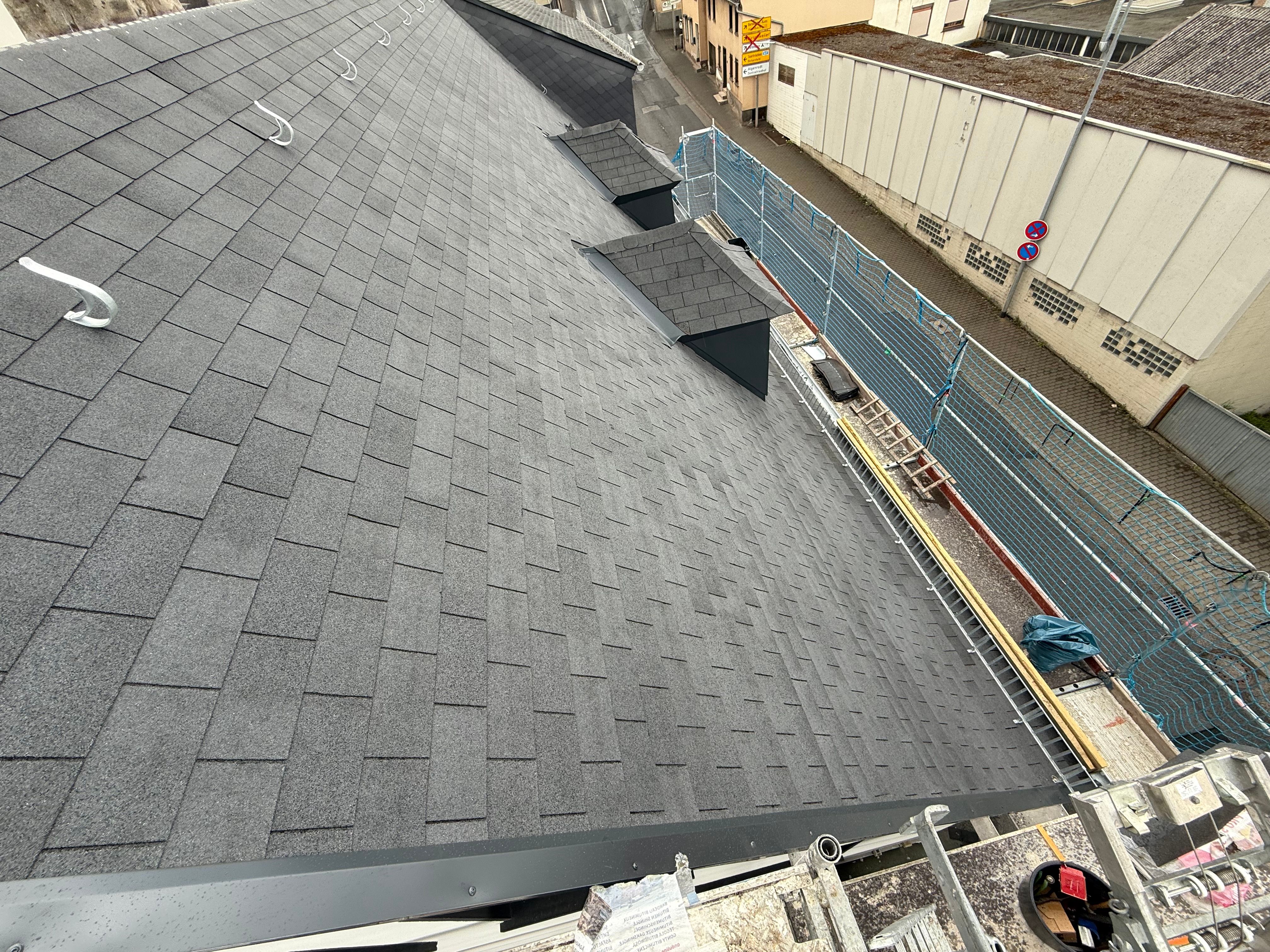 Bei diesem Sanierungsprojekt haben wir ein Steildach mit Bitumenschindeln neu eingedeckt und gleichzeitig neue Gauben integriert. Das Ergebnis: Ein optisch aufgewertetes Dach mit mehr Wohnraum im Dachgeschoss.