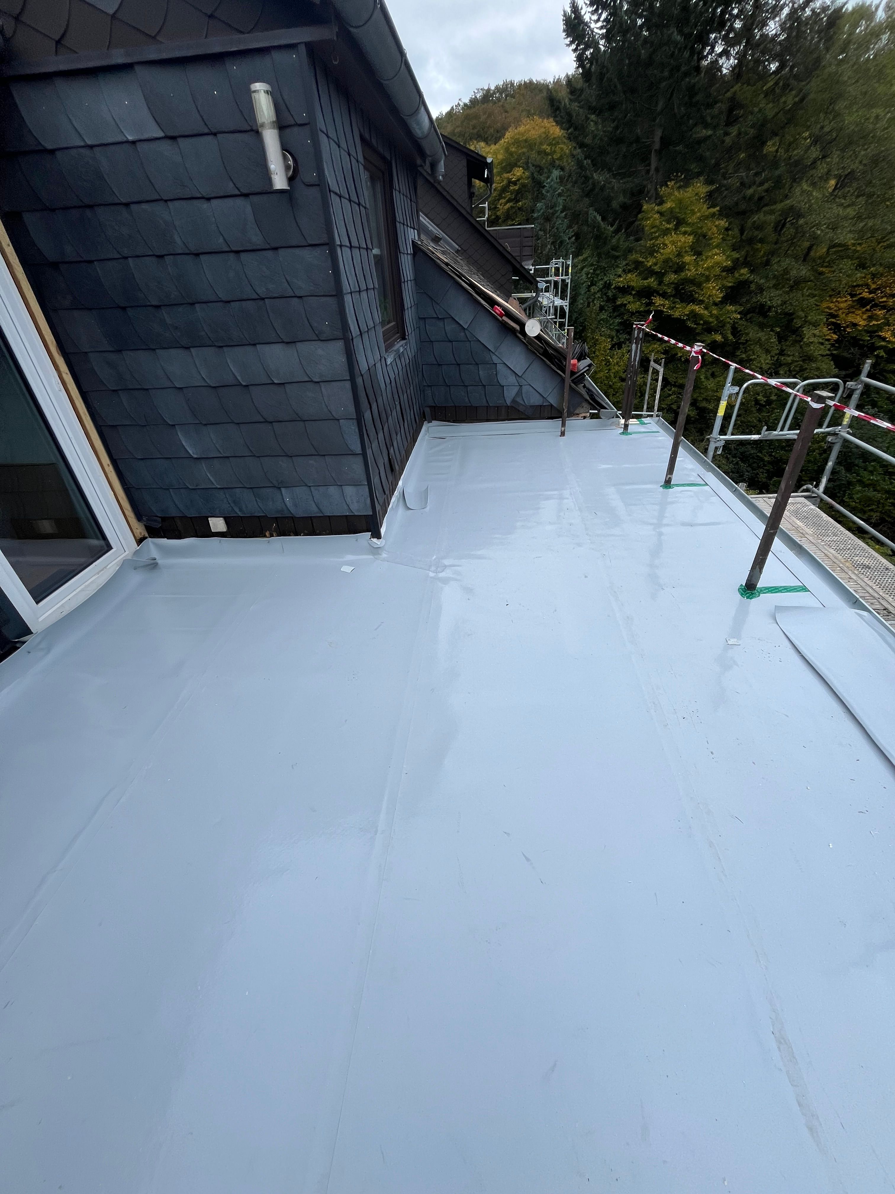 Die Flachdachabdichtung wurde mit hochwertigen Abdichtungsbahnen ausgeführt. Besondere Aufmerksamkeit galt den Anschlüssen an aufgehende Bauteile und den Durchdringungen. Nur wenn die Abdichtungsebene komplett intakt ist, kann die darüberliegende Terrasse dauerhaft trocken bleiben.
