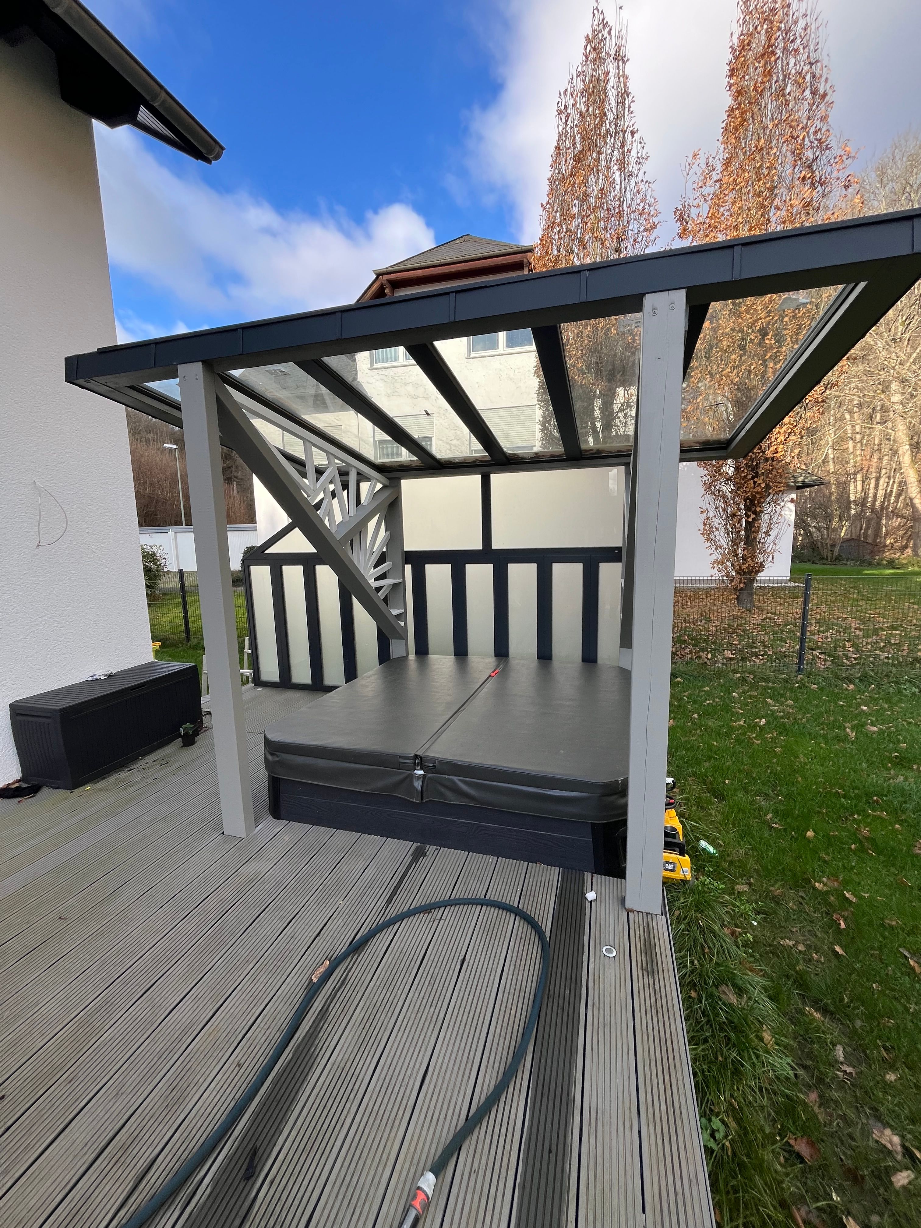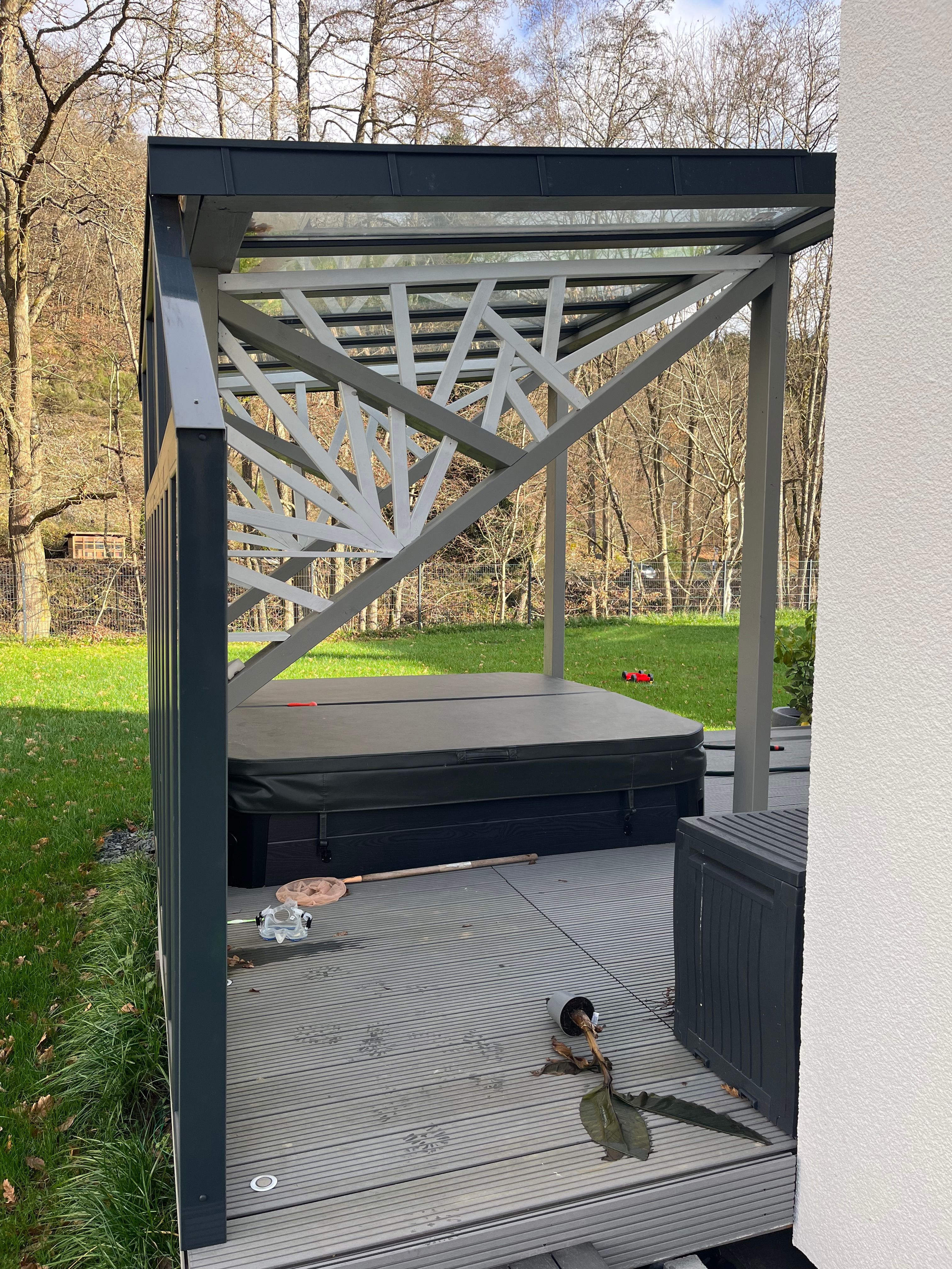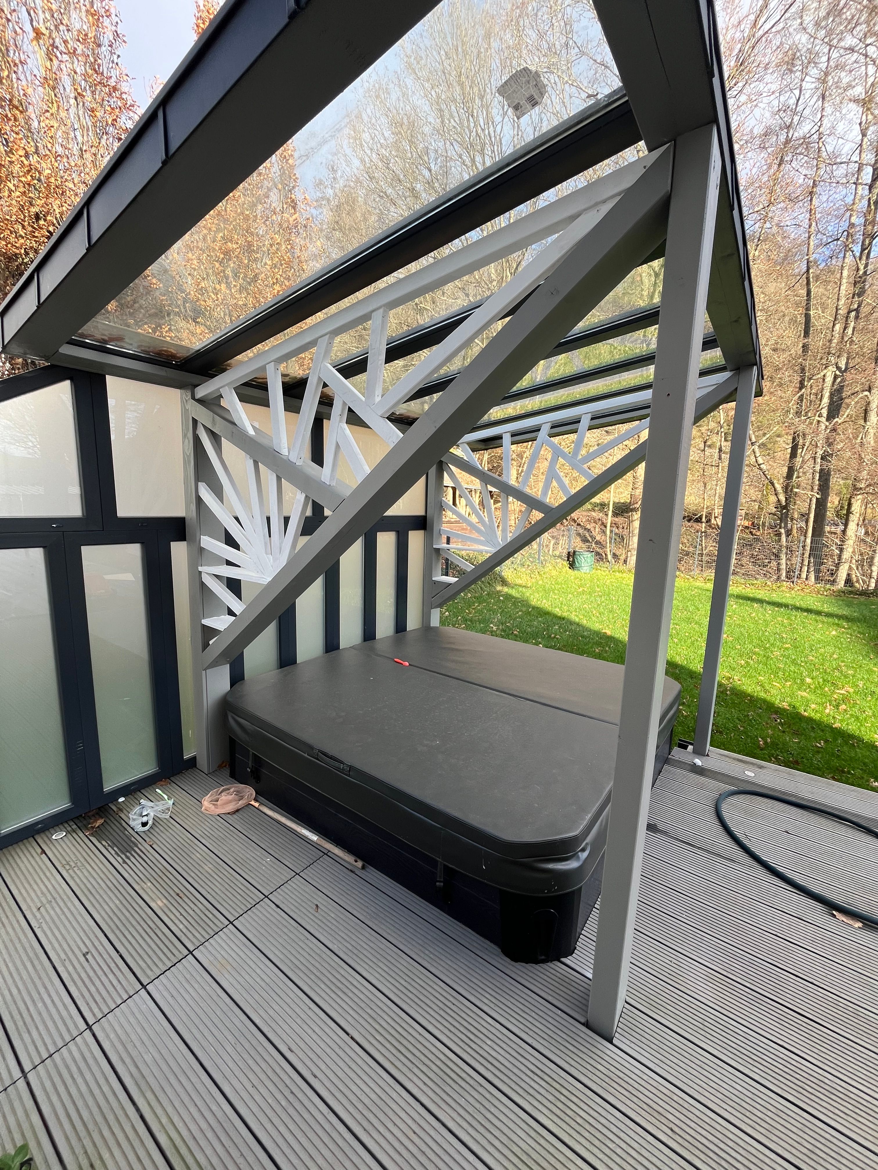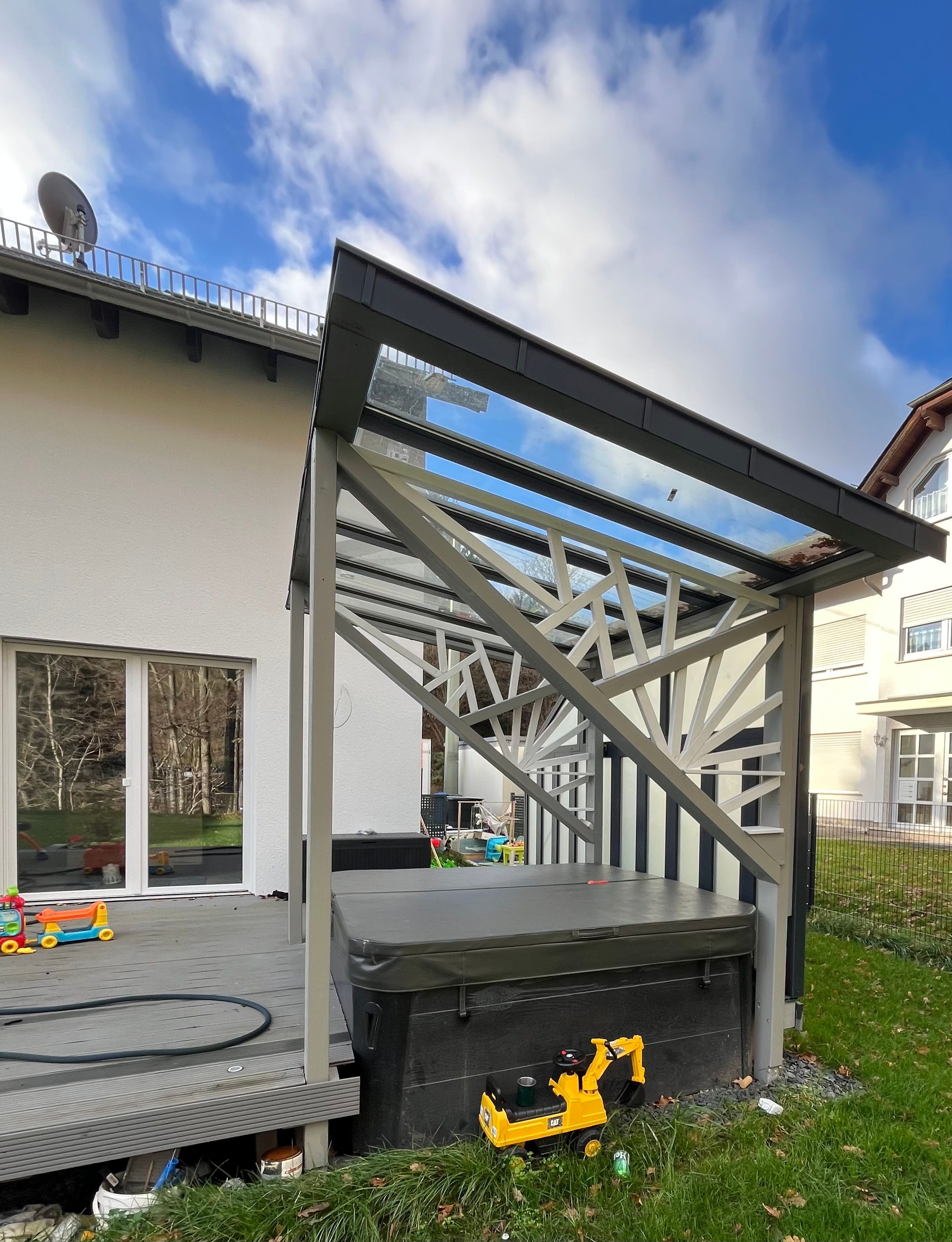 Wir haben eine Konstruktion gewählt, die sowohl Schutz vor Niederschlag als auch ausreichend Lichteinfall bietet. Die Überdachung wurde an die Architektur des Hauses angepasst und fügt sich nahtlos in das Gesamtbild ein.
